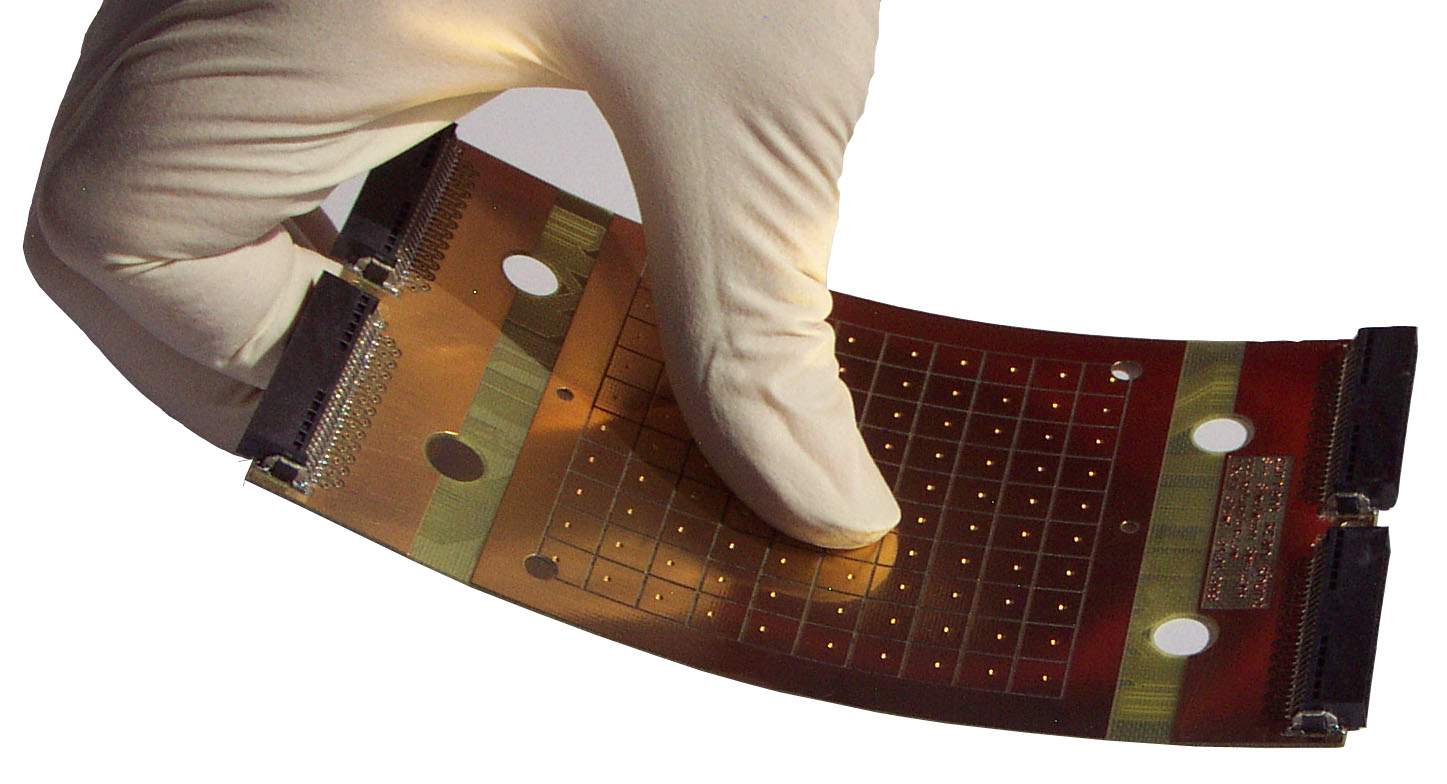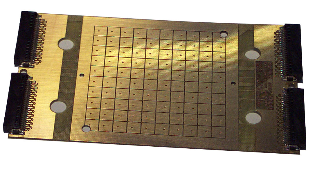 The device of type current scan shunt shown above has a resolution of 10 x 10 measurement cells and an active area of 50cm². Because of the simple internal structure it is suitable for mass production. So the current scan shunt can also be applied in series production of fuel cells. It can be used for example for control applications. The picture below shows the sensor plate.