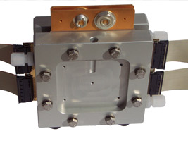 Standard devices are available with 25cm² and 50cm². The following picture showes a sensor plate equiped with flat ribon cables to the electronic, inserted into a 50cm² single cell fuel cell.